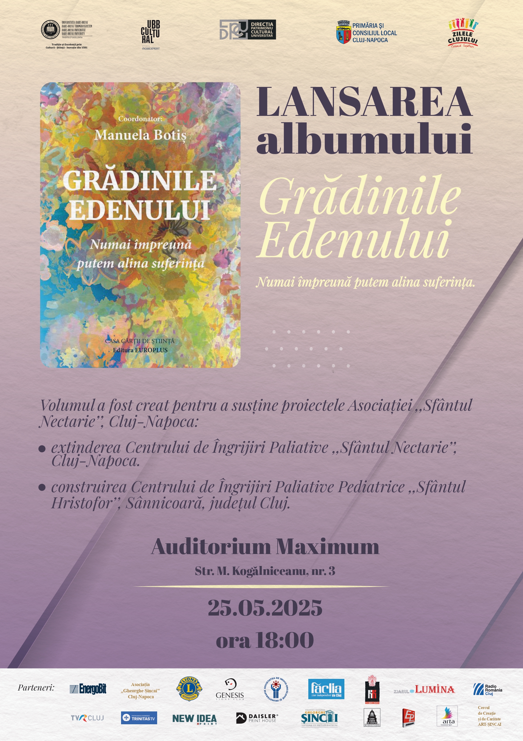 Direcția Patrimoniu Cultural Universitar a Universității Babeș-Bolyai din Cluj-Napoca (UBB), în colaborare cu artista Manuela Botiș, profesor la Colegiul Național „Gheorghe Șincai”, organizează lansarea albumului Grădinile Edenului. Numai împreună putem alina suferința, eveniment cu scop caritabil, pentru a susține proiectele Asociației „Sfântul Nectarie” Cluj-Napoca.
