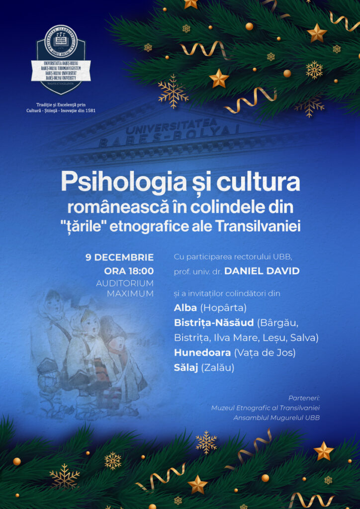 Universitatea Babeș-Bolyai din Cluj-Napoca vă invită la evenimentul caritabil „Psihologia și cultura românească în colindele din „țările” etnografice ale Transilvaniei” – Alba (Hopârta), Bistrița-Năsăud (Bârgău, Bistrița, Ilva Mare, Leșu, Salva), Hunedoara (Vața de Jos), Sălaj (Zalău) -, unde psihologul Daniel David, rectorul UBB va comenta psihologic și cultural (psihocultural) tradițiile românești exprimate prin colinde specifice acestor zone etnografice ale țării, cu rol educațional și de dezvoltare psihoculturală, în contextul bucuriei sărbătorilor de iarnă.