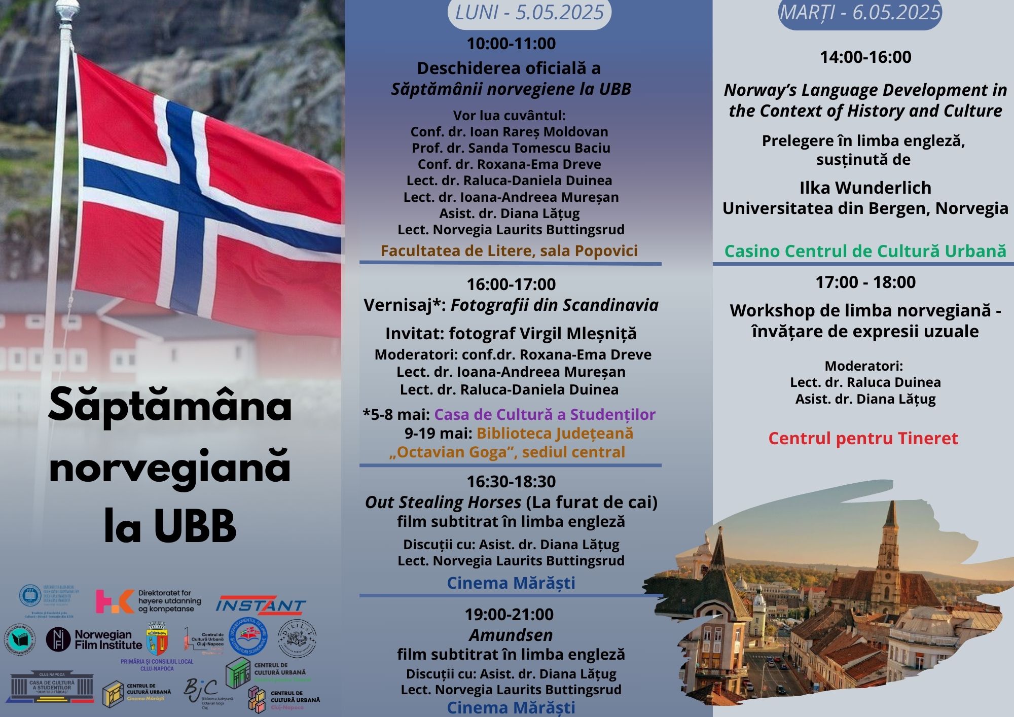 Deschiderea Săptămânii norvegiene la UBB va avea loc în 5 mai 2025, ora 10.00, Facultatea de Litere, sala Popovici. Vor lua cuvântul: Decan, conf. dr. Ioan Rareș Moldovan, prof. dr. Sanda Tomescu Baciu, conf. dr. Roxana-Ema Dreve, lect. dr. Raluca-Daniela Duinea, lect. dr. Ioana-Andreea Mureșan, asist. dr. Diana Lățug, lect. Norvegia Laurits Buttingsrud. Programul se continuă la ora 16.00 cu vernisajul expoziției Fotografii din Scandinavia (Casa de Cultură a Studenților, invitat fotograf Virgil Mleșniță), sponsorizate de Instant Norge. Expoziția se mută în perioada 9-19 mai 2025 la Biblioteca Județeană „Octavian Goga”, sediul central. Moderatori: conf. dr. Roxana-Ema Dreve, lect. dr. Ioana-Andreea Mureșan, lect. dr. Raluca-Daniela Duinea. Ziua de 5 mai 2025 se încheie cu vizionare de filme la Cinema „Mărăști”: ora 16.30 Out Stealing Horses (La furat de cai) și ora 19.00, Amundsen. Filmele fac parte din colecția NFI (Norsk filminstitutt), sunt subtitrate în limba engleză și vor fi urmate de discuții moderate de asist. dr. Diana Lățug și lect. Norvegia Laurits Buttingsrud.